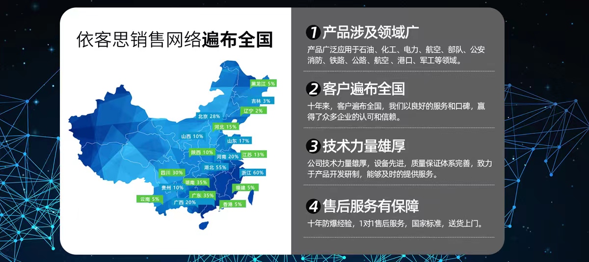 依客思防爆專注于防爆產品的研發、生產與銷售,主要產品有:防爆操作柱、BXCQ防爆靜電釋放儀、BZC系列防爆操作柱、不銹鋼現場操作箱、BXM(D)防爆照明(動力)配電箱、BXX防爆檢修箱、BXJ防爆接線箱、LED防爆燈、防爆管件、防爆風機等產品,型號規格齊全,廣泛適用于煤炭、電力、醫藥、石油、化工、航空等領域。我公司產品質量過硬,價格實惠,銷售范圍廣,且與各大型企業建立了良好的合作關系,同時還遠銷中、東亞和北美等地區,深受用戶喜愛與青睞。如有需要請留意,稍后將有客服與您聯系